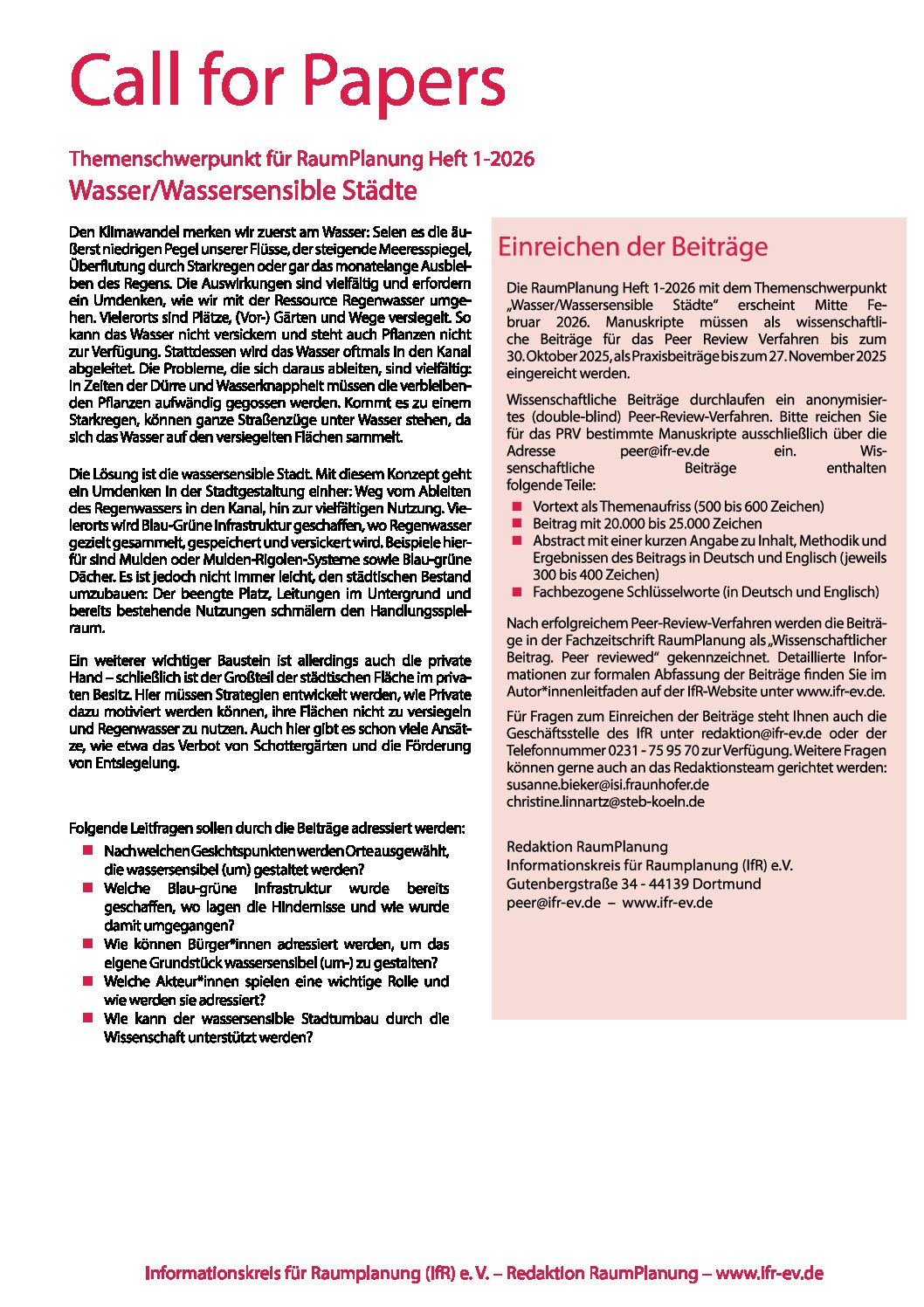 An dieser Stelle sind alle aktuellen Call for Papers für die Fachzeitschrift RaumPlanung einzusehen. Für weitere Informationen wenden Sie sich bitte an: redaktion@ifr-ev.de oder an die jeweiligen HeftbetreuerInnen.